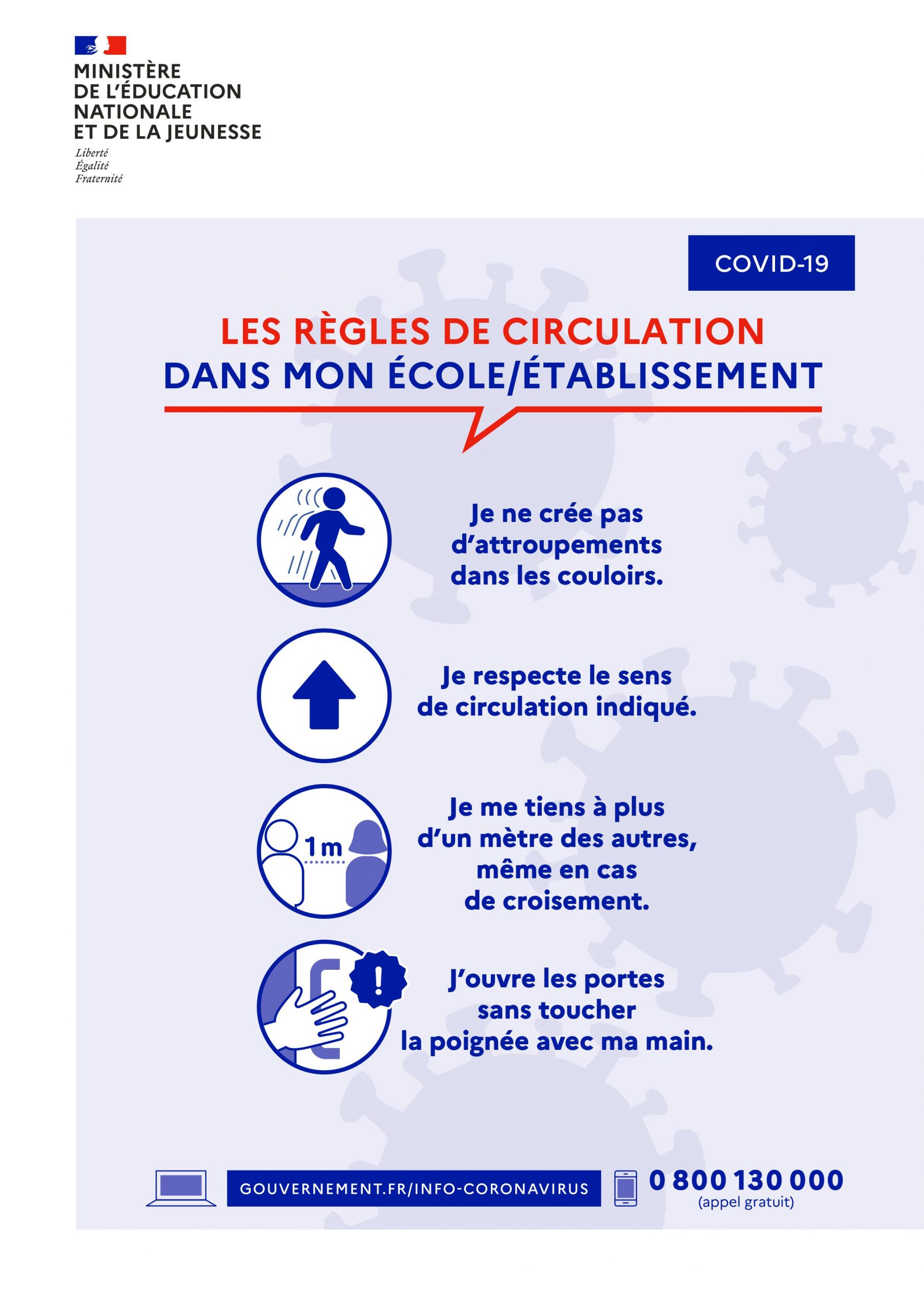 - la circulation des élèves dans les bâtiments : les déplacements des élèves doivent être limités, organisés et encadrés. Pour cette raison, il est recommandé d’attribuer une salle à chaque classe (en dehors des salles spécialisées et des ateliers).