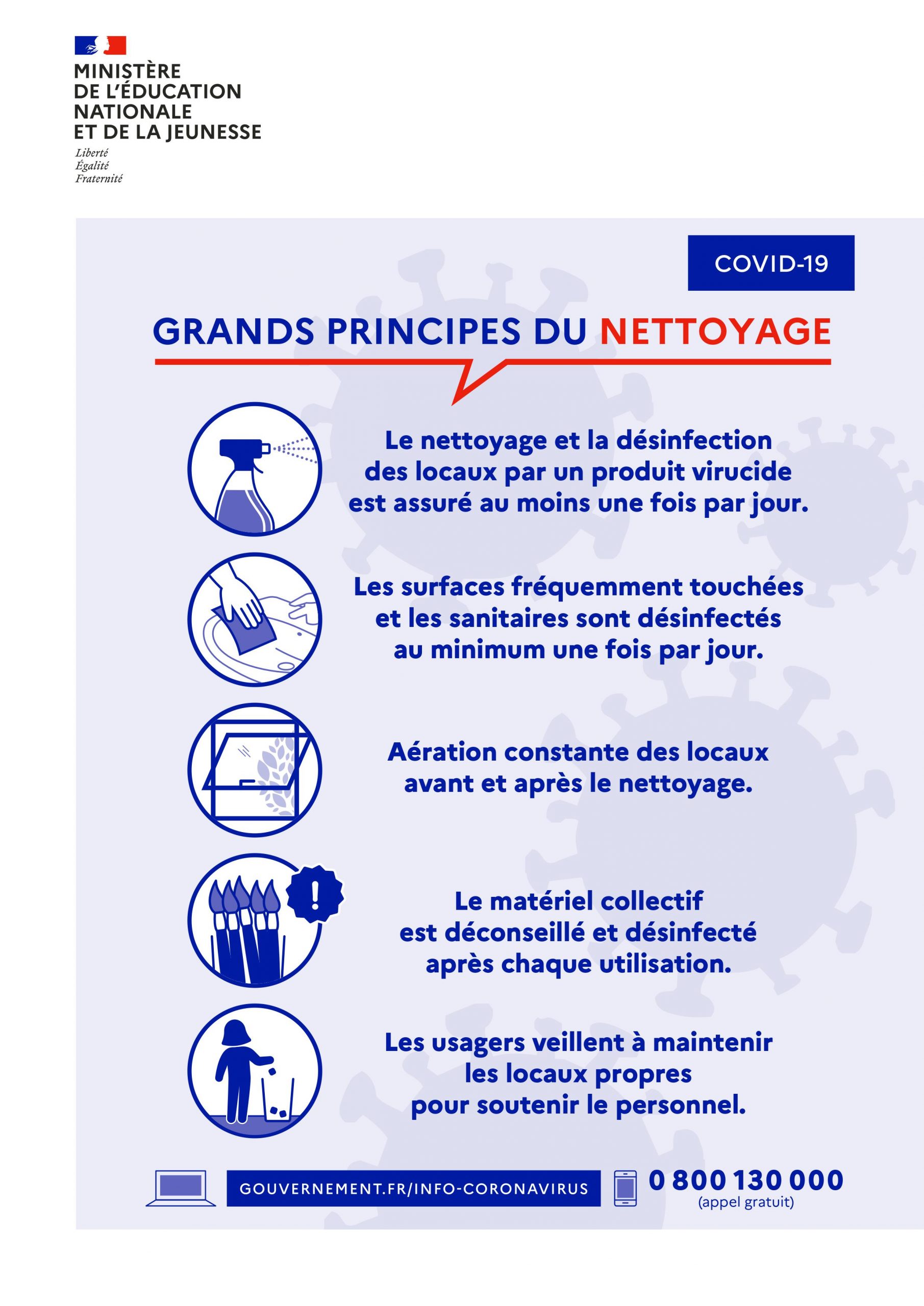 Le nettoyage et la désinfection des locaux et des équipements sont une composante essentielle de la lutte contre la propagation du virus. Avec l’appui de la collectivité locale, il revient à chaque école et établissement de l’organiser selon les principes développés ci-après.