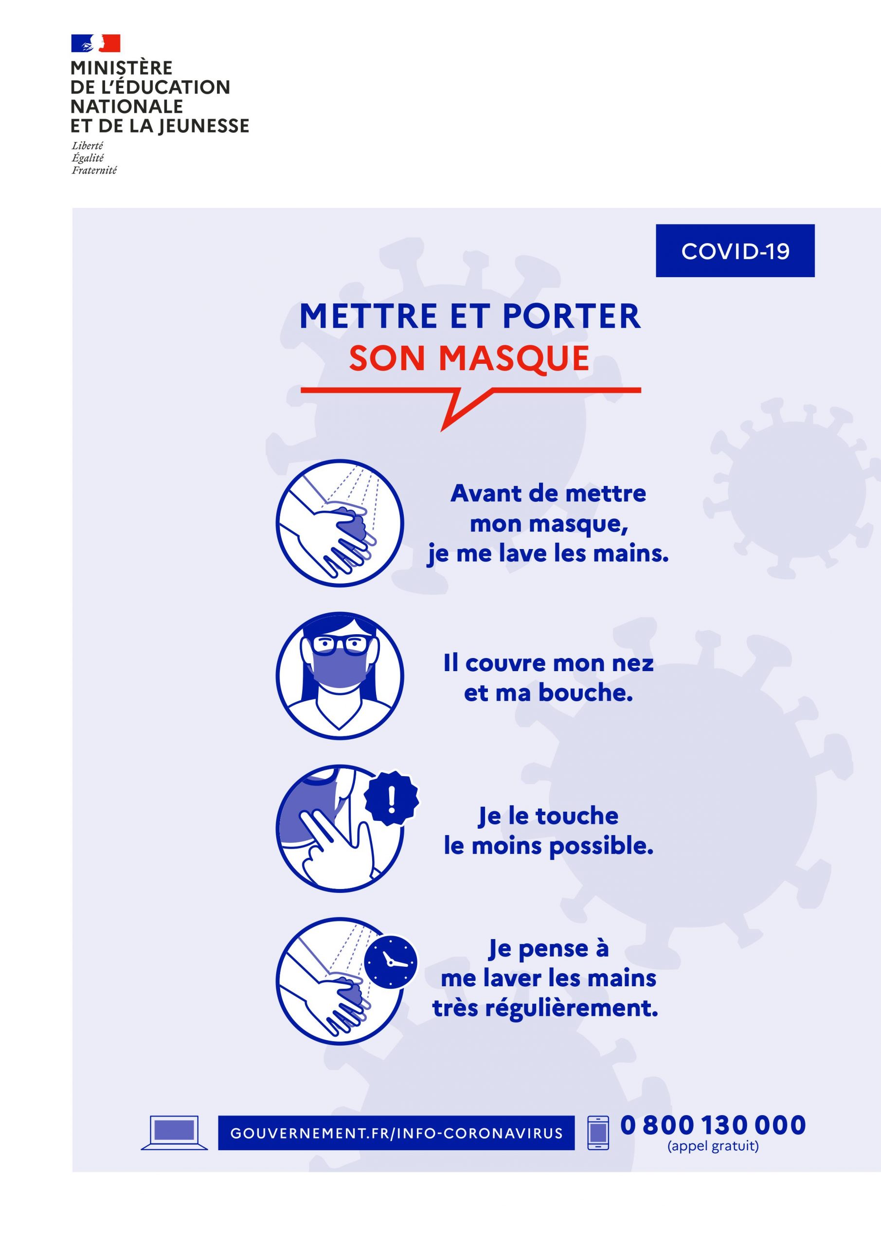 Le ministère de l’Éducation nationale et de la Jeunesse met donc à disposition de ses agents en contact direct avec les élèves au sein des établissements des masques dits « grand public » de catégorie 1, à raison de deux masques pour chaque jour de présence dans les établissements.