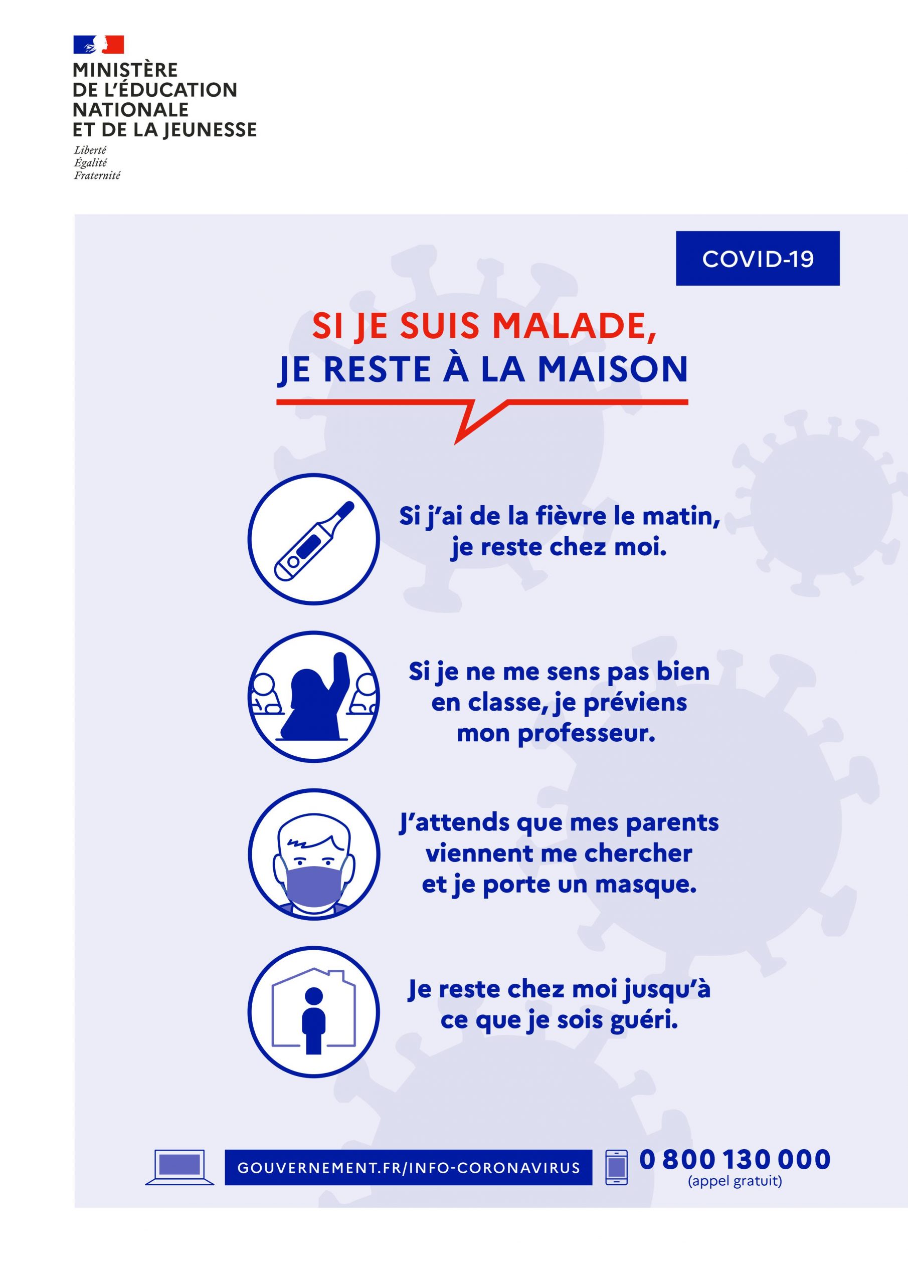 Les parents d’élèves jouent un rôle essentiel. Ils s’engagent à ne pas mettre leurs enfants à l’école, au collège ou au lycée en cas de fièvre (38 °C ou plus) ou en cas d’apparition de symptômes évoquant la Covid-19 chez l’élève ou dans sa famille.