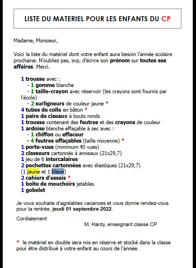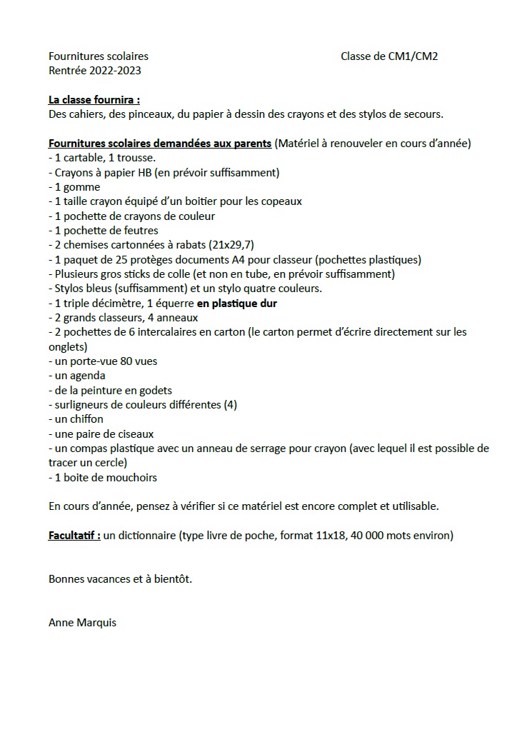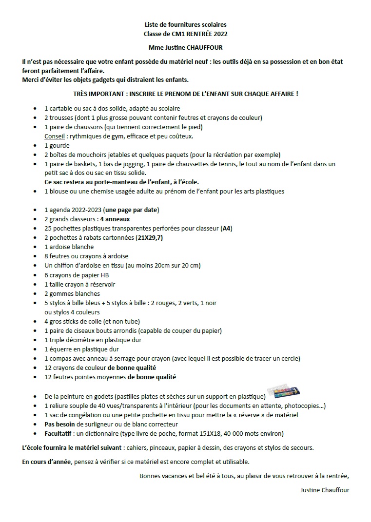 Veuillez trouver ci dessous la liste de matériel pour l’année scolaire 2022-2023.
