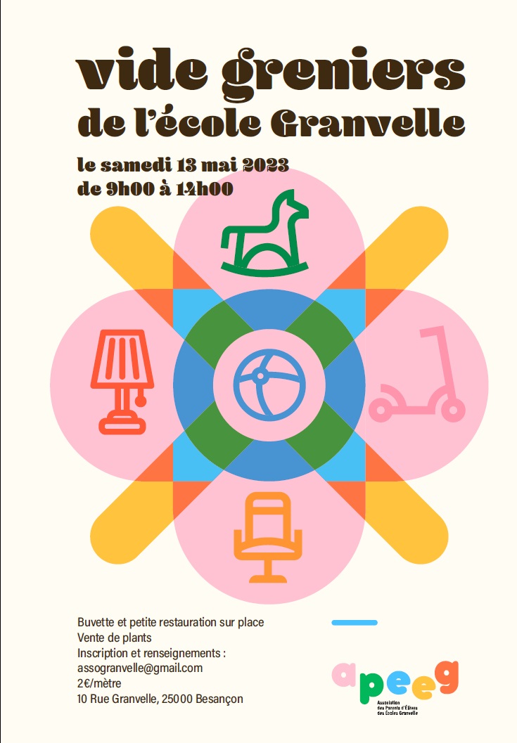 L’APEEG tiendra un stand au profit de l’association. Les familles qui le souhaitent peuvent faire dons d’objets pour ce stand à déposer la veille à l’école à partir de 16h30 et au plus tard le 13/05 avant 09h00. Les inscriptions et les demandes de renseignement se font via assogranvelle@gmail.com .