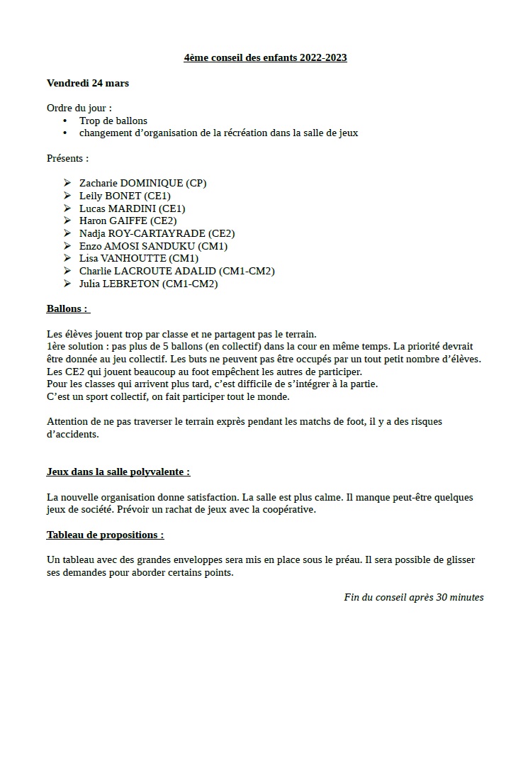 En voici le compte-rendu : quatrième conseil des enfants 2022-2023