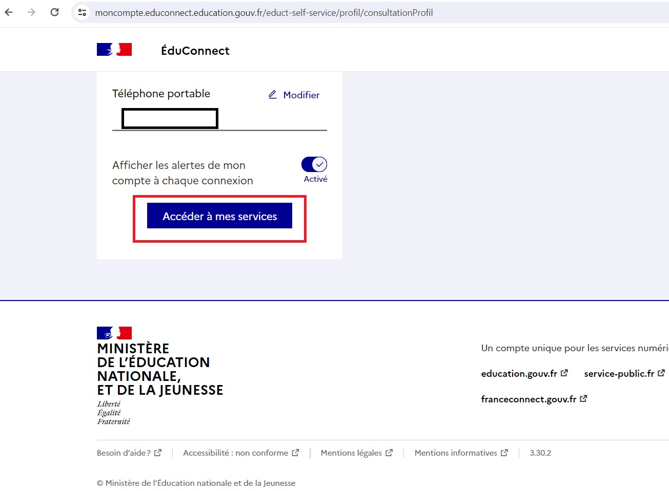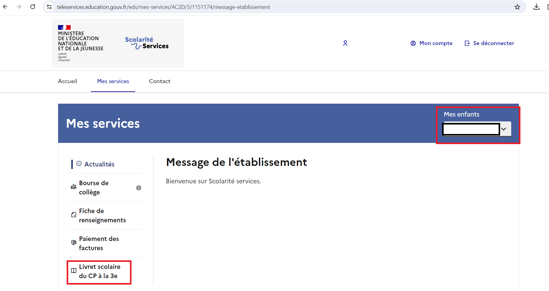 Cliquer sur “services” pour parvenir au livret de votre enfant. Vous pouvez également modifier les éléments de votre compte si des changements ont eu lieu.